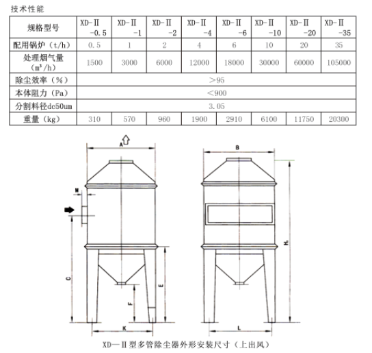 XD—II型多管旋風除塵器是一種除塵器,除塵器率可達95%以上,除塵器本體阻力低于900Pa,用現(xiàn)有的鍋爐引風機就能保證鍋爐正常運行。本除塵器負荷適應(yīng)性好,在70%負荷時,除塵效率在94%以上。