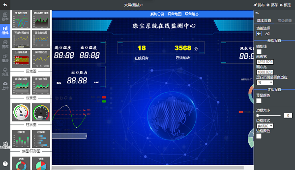 設備遠程管理及預警系統(tǒng)具有組態(tài)功能單元,可利用工具欄中組態(tài)工具進行編輯組態(tài),也可上傳圖片資料作為組態(tài)素材,操作靈活,方便。